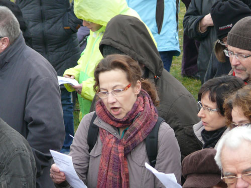 Die Kreisoberpfarrerin Annegret Friedrich-Berenbruch, ihres Zeichens wie zahlreiche Kirchengemeinden auch, aktives Mitglied im Netzwerk GELEBTE DEMOKRATIE, hat eine klare Botschaft parat, für die sie Szenenapplaus bekommt: „Wir überlassen den Geschichtsfälschern dahinten nicht das Feld.“ Alle die heute gekommen sind, würden demnach das Grundgesetz verteidigen. Die Kirchenvertreterin schließt die anwesenden Sicherheitskräfte zudem ausdrücklich mit ein: „Die Polizei schützt die Meinungsfreiheit, nicht die Meinung.“ Wie zuvor schon andere, fordert sie darüber hinaus eine lückenlose und transparente Aufklärung der Ermittlungspannen im Zusammenhang mit den NSU-Morden.