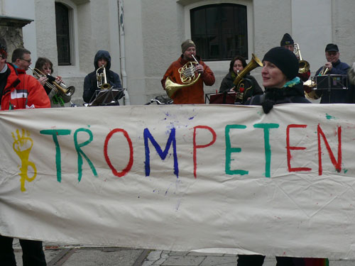 Die erste Station: Die Kundgebung „Trompeten gegen Rechts“ in der Johannisstraße. Dort hat sich der Bläserchor der Kirchengemeinden aufgestellt, um den Nazis den Marsch zu blasen. Augenscheinlich hatten die Organisator_innen bei der Wahl des Kundgebungsstandortes eine prophetische Eingabe. Denn was vor dem 10. März 2012 höchstens gemutmaßt werden konnte, sollte sich schließlich bewahrheiten: Die Neonazidemo führte tatsächlich durch die enge Straße. Und flugs fanden sich so viele Freunde der Tubas und Posaunen ein, dass es für die Nazis kein Durchkommen mehr gab. Die erste effektive Blockade führte dazu, dass der braune Aufzug gut eine halbe Stunde feststeckte. Übrigens lautstark beschallt von internationalen Klängen aus dem Schwabehaus. Schließlich leitete die Polizei die Rechten über die Hausmannstraße ins Stadtzentrum.