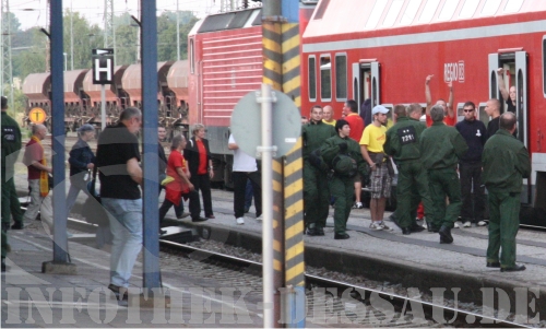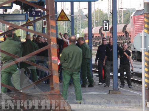 19. September 2009 / Wittenberg / Dessau-Roßlau Eine ca. 30köpfige Gruppe von Fans und Mitgliedern aus dem Umfeld des Dessauer Fußballvereins „ASG Vorwärts“ hielten sich gegen 19.00 Uhr auf dem Wittenberger Bahnhof auf und skandierten dort extrem rechte Parolen. Die Anfeindungen der ASG-Anhänger richteten sich dabei gegen alternative Jugendliche. Unter den Fans des Vereins befanden sich u.a. bekannte Aktivisten einer Neonazikameradschaft (mehr dazu hier…) (und hier…), die teils am Vormittag in der Lutherstadt an einer Kundgebung der neonazistischen NPD teilgenommen hatten (mehr dazu hier…).