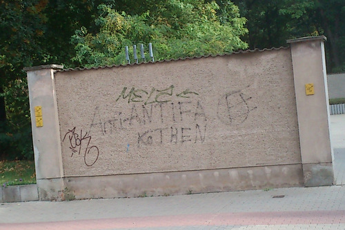 An einer Wand direkt neben dem Amtsgericht in Köthen ist ein rechtsextremes Graffiti aufgesprüht worden. Die offensichtlich bereits ältere Schmiererei zeigt den Schriftzug „Anti-Antifa Köthen“. Dieser Slogan ist in der militanten Neonazi-Szene beliebt und wird von Personen verwendet, die damit ihre vermeintlichen oder realen politischen Gegner bedrohen und einschüchtern wollen.