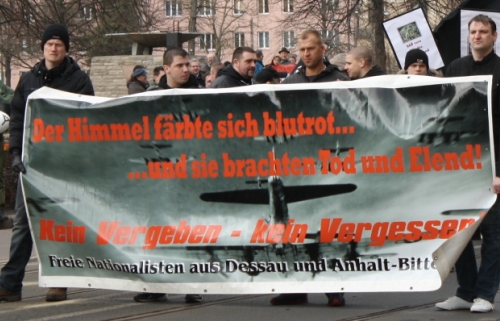 14. Januar 2012 / Magdeburg und Region Anhalt  Am sogenannten Trauermarsch der Magdeburger "Initiative gegen das Vergessen" nahmen am 14. Januar auch in diesem Jahr wieder Neonazis aus der Region Anhalt teil. Zwischen 1000 und 1200 Neonazis und Rechtsextremisten zogen durch Magdeburg. Der Neonazi-Aufmarsch, der alljährlich um den Termin der Bombardierung Magdeburgs im Zweiten Weltkrieg stattfindet, bildet den Auftakt der „Trauermarsch-Saison“. In zahlreichen Städten werden Aufmärsche organisiert, die die Neonazis zum verbreiten ihrer revisionistischen Ideologie nutzen. |