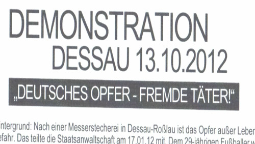 Unterstützer der angekündigten Demonstration „Deutsche Opfer –Fremde Täter“, die aus dem Umfeld der Dessau-Roßlauer Neonaziszene angemeldet wurde haben an verschieden Orten in Sachsen-Anhalt Flyer zur Unterstützung der Demonstration am 13. Oktober 2012 (mehr zur Demonstration hier…) verteilt. Die kopierten Handzettel tauchten unter anderem in Halle auf.