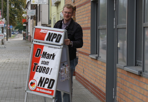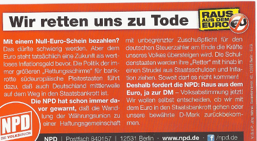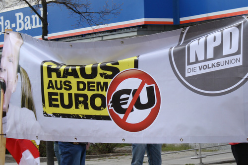 Der Wittenberger Kreisverband der rechtsextremen NPD hat ein weiteres Mal versucht (mehr hier… und hier…), mit kruder „Anti-Euro“ und „Zurück zur D-Mark“ Rhetorik politischen nutzen aus der Euro- und Finanzkrise zu schlagen. Wie schon in den Vormonaten wurde ein Infostand in der Lutherstadt angemeldet, um entsprechendes Propagandamaterial zu verteilen.