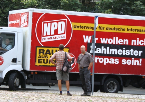 Wie die Mitteldeutsche Zeitung berichtete, hat die NPD auf der Themenstraße "Weltoffenes Sachsen-Anhalt" im Rahmen des Sachsen-Anhalt-Tages rechtsextremes Propagandamaterial verteilt. Die Beratungsstelle für Opfer rechter Gewalt (mehr dazu hier...) informierte demnach die Öffentlichkeit über die Aktion der neonazistischen Kampfpartei. Nur vier Wochen später machte die NPD indes im Rahmen ihrer antieuropäischen Kampagne "Raus aus dem Euro" Station in Dessau-Roßlau (mehr dazu hier...).