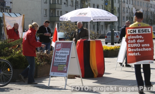21. April 2012 / Dessau-Roßlau  Für den 21. April 2012 hatte die rechtsextreme NPD zu einem sogenannten bundesweiten Aktionstag aufgerufen. Dies nutzten die Mitglieder der regionalen Kreisverbände der Partei, um auch in Dessau-Roßlau mit der schon bekannten Anti-Europa-Propaganda einen Infostand zu betreiben. Wie schon in der Vorwoche in Wittenberg (mehr hier...) wurde vor dem Hintergrund der Euro- und Finanzkrise versucht rechtsextremes Propagandamaterial zu verteilen. |