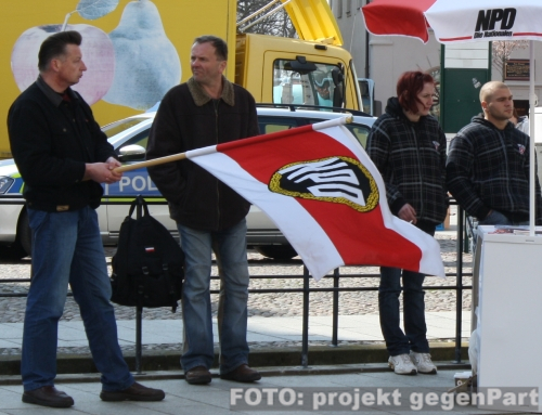 14. April 2012 / Wittenberg  Zum wiederholten Male war die rechtsextreme NPD mit einem Infostand in Wittenberg präsent (mehr hier...). Am 14. April 2012 verteilten die Aktivisten der Partei ihre Propaganda am Rande des Marktplatzes. Wie bei den vorangegangenen Infoständen auch, versuchten die NPD-Anhänger mit der derzeitigen Euro- und Finanzkrise als Thema zu punkten und verteilten Anti-Europa-Propaganda. |