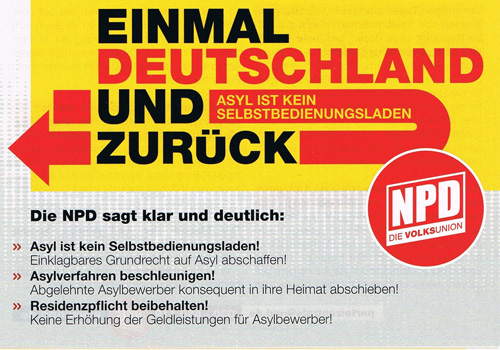 Ein engagierter Bürger macht die Mitarbeiter des Mobilen Beratungsteams darauf aufmerksam, dass es in einigen Teilen der Wittenberger Innenstadt Propagandamaterial der rechtsextremen NPD verteilt wurden. In der Nacht hatten offensichtlich Anhänger der Partei Postkarten in Briefkästen im Stadtgebiet gesteckt und zahlreiche Aufkleber angebracht. Die verteilte Postkarte mit der Überschrift „Einmal Deutschland und zurück“ ist Teil einer Kampagne mit der die NPD bundesweit versucht hatte, gegen Asylbewerber und Migranten Stimmung zu machen.