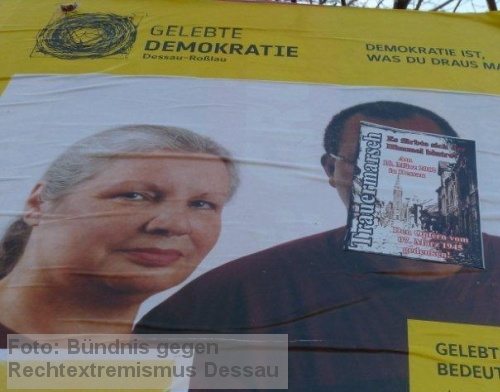 06. März 2012 / Dessau-Roßlau Im Vorfeld des sogenannten Trauermarsches von Neonazis aus dem Spektrum der freien Kameradschaften und der NPD in Dessau-Roßlau, haben mutmaßliche Rechtsextreme mehrere Plakate des Netzwerkes Gelebte Demokratie Dessau-Roßlau beschädigt. So wurde auf zahlreichen Plakaten ein Aufkleber zur Werbung für den Neonazi-Aufmarsch angebracht sowie einige Plakate zerstört.