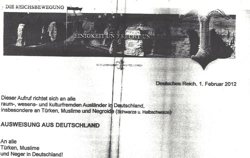 Die islamische Gemeinde der Stadt findet in ihrem Briefkasten ein Schreiben der als rechtsextrem eingestuften Gruppierung "DIE REICHSBEWEGUNG" vor. In dem achtseitigen Brief der die Überschrift "Ausweisung aus Deutschland" trägt, finden sich neben verschwörungstheoretischen Sequenzen und kruden historischen Interpretationen, zudem mehrere eindeutig rassistisch markierte Passagen. So werden afrikanische Migrant_innen mehrmals als "Neger" tituliert. Und an andere Stelle heißt es: "Ihr Platz ist ohnehin in Ihrem Heimatland und nicht hier in Deutschland. Gehen Sie daher dorthin zurück!"