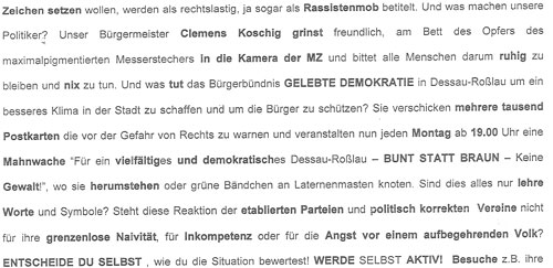 13. Februar 2012 / Dessau-Roßlau Bislang unbekannte Autoren, die sich selbst als "Arbeitstkreis - Steh auf für ein besseres Miteinander" bezeichnen, verteilen in Briefkästen der Dessauer Innenstadt mehrere hundert Exemplare einer Flugschrift mit dem Titel "Aufschrei der Vernunft". Die Veröffentlichung, auf der kein presserechtlich Verantwortlicher angegeben ist, ist gekennzeichnet durch stereotype Zuschreibungen und demokratiefeindliche Argumentationen. So wird u. a. das Engagement des hiesigen Netzwerkes GELEBTE DEMOKRATIE (mehr dazu hier...) geschmählert und die Teilnahme von Rechtsextremisten und Neonazis an Demonstrationen im Januar 2012 (mehr dazu hier...) und (hier...) verharmlost.