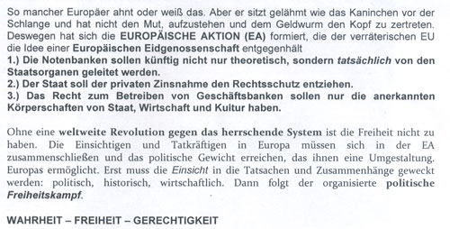Im Innenstadtbereich können in Briefkästen mehere Dutzend Flugblätter festgestellt werden, die mit dem Titel "Griechenlands Ruin geht alle an" überschrieben sind. Durch das eurofeindliche Pamphlet zieht sich eine antikapitalistische Argumentationslinie, die augenscheinlich antisemitisch tradiert ist. Zudem wird eine krude Revolutionsrhetorik bedient. Als Herausgeber firmiert die "EUROPÄISCHE AKTION" um den Schweiter Rechtsextremisten Bernhard Schaub. Schaub gilt als eine zentrale Figur in der europäischen Szene der Holocaustleugner und war für die rechtsextreme Partei National Orientierter Schweizer (PNOS) tätig. |