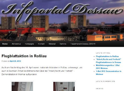 20. April 2012 / Dessau-Roßlau und Region Anhalt  Im Nachgang des alljährlichen Neonazi-Aufzugs in Dessau-Roßlau (mehr dazu hier...) wurde aus dem Umfeld der sogenannten Freien Nationalisten Dessau-Bitterfeld eine neue Internetpräsenz angemeldet. Auf der "Infoportal Dessau" genannten Seite wird für bevorstehende rechtsextreme Ereignisse geworben und rechtsextreme Propaganda verbreitet. Die Website nutzt den gleichen Hosting-Service wie zahlreiche regionale und überregionale rechtsextreme Seiten. |