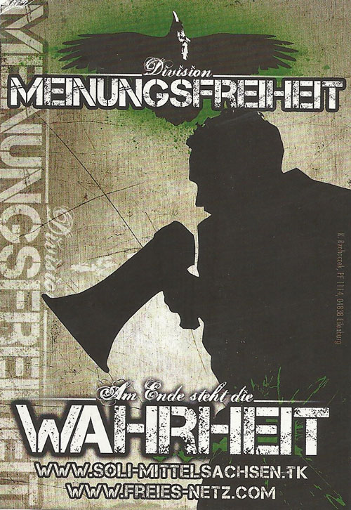 23. Mai 2012 / Dessau-Roßlau Im Dessauer Stadtteil Nord werden mehrere Dutzend rechtsextreme Sticks festgestellt und von engagierten Bürger_innen zugleich entfernt. Auf den neonazistischen Propagandaträgern ist u. a. der Slogan "Division Meinungsfreiheit - Am Ende steht die Wahrheit" zu lesen. Damit spielt die extrem rechte Szene mit dem Begriff "Division" u. a. auf die nationalsozialistische Wehrmacht an und halluziniert sich in einen verschwörungstheoretischen Wahrheitsbegriff, der mit einem eindeutigen NS-Bezug zudem geschichtsrevisionistisch aufgeladen ist.