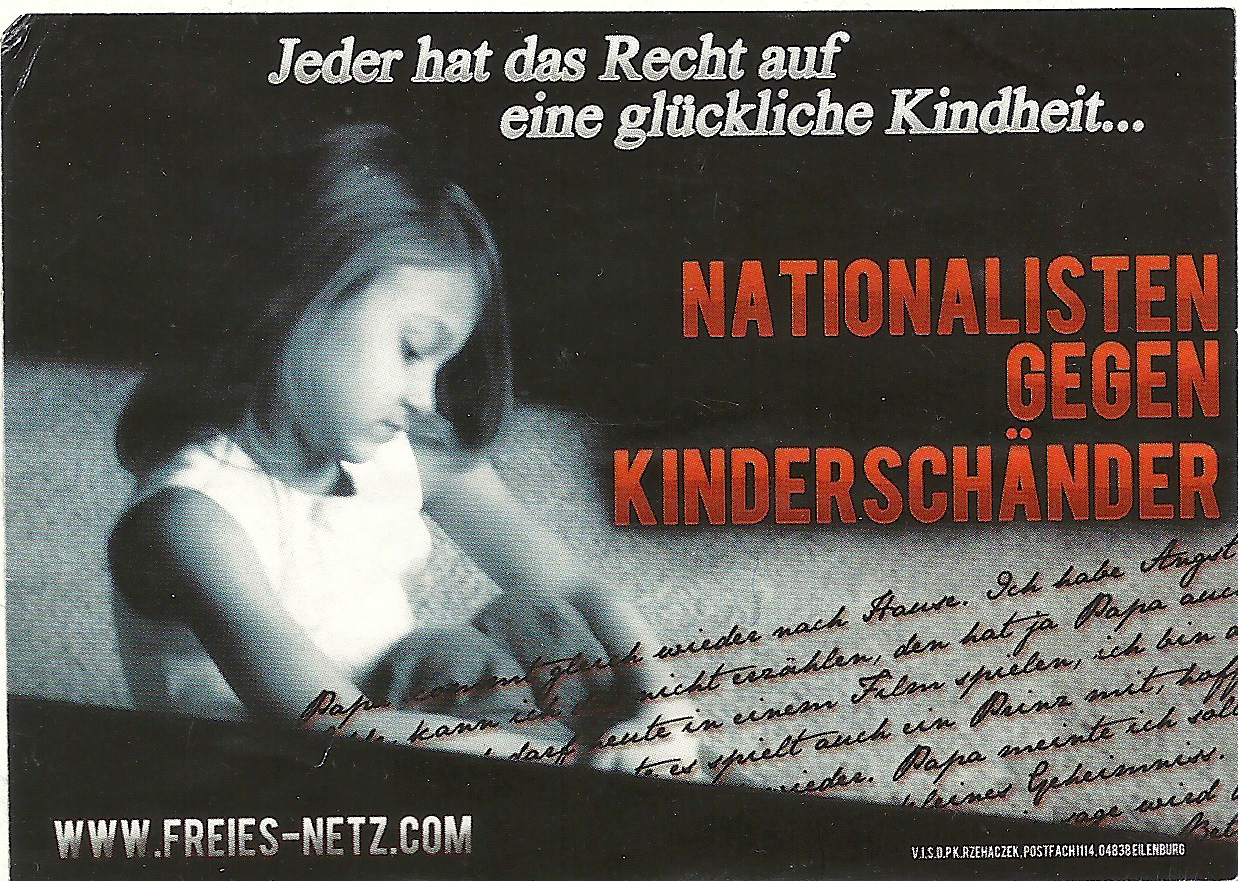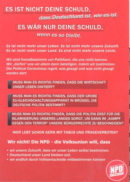 Die neonazistische NPD (Kreisverband Anhalt-Bitterfeld) verteilt in Briefkästen der Dessauer Innenstadt mehrere hundert Exemplare einer Postkarte. Neben einer populistischen Hetze gegen die etablierte Politik, finden sich auf dem Propagandaträger EU-feindliche Argumentationszusammenhänge und subtextuale, rassistische Anspielungen. Zudem stilisiert sich die rechtsextreme Partei in die Rolle einer vermeintlichen Tabubrecherin. |