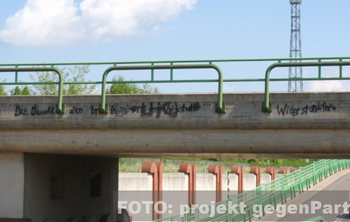 03. April 2012 / Bitterfeld-Wolfen Nach Angaben der Polizei ist es in Bitterfeld-Wolfen in den ersten Monaten des Jahres 2012 wiederholt zu rechtsextremen Schmierereien im Stadtgebiet gekommen. Unbekannte schmierten mehrfach rechtsextreme Parolen und die Internet-Adresse einer rechtsextremen Seite an Wände, Brücken und Unterführungen. Informationen der Mitteldeutschen Zeitung zufolge, geht die Polizei von mindestens fünf Fällen aus.