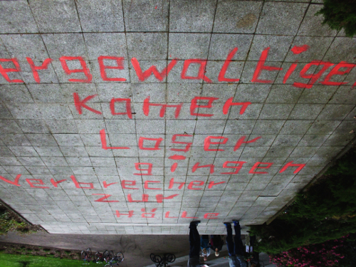 08. Mai 2012 / Wittenberg  Unbekannte Personen schrieben in der Nacht zum 08. Mai 2012 auf dem Weg zum Wittenberger Ehrenfriedhof großflächig Parolen auf den Gehweg. Mit roten Buchstaben wurde dort "Vergewaltiger kamen Loser gingen Verbrecher zur Hölle" auf den Boden geschmiert. Aufgrund des Bezuges zum 8. Mai, dem Jahrestag der Kapitulation des 3. Reiches, ist die rechtsextreme Motivation der Schmiererei offensichtlich und der polizeiliche Staatsschutz hat die Ermittlungen übernommen. |