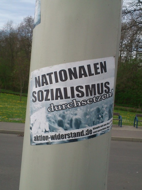 26. April 2012 / Bad Schmiedeberg (Landkreis Wittenberg)  Ein Mitarbeiter des Mobilen Beratungsteam Anhalt stellt in der Nähe des Bahnhofs in Bad Schmiedeberg zahlreiche rechtsextreme Aufkleber fest. Diese wurden an Laternen und den Buswartehäuschen verklebt. Die Motive und verwendeten Parolen sind dem Umfeld der freien Kameradschaften zuzurechnen. Zahlreiche der rechtsextremen Propagandasticker verweisen auf Kampagnen des "Freien Netzes" und auf die Website "Aktion Widerstand". In den Parolen wird unter anderem in Anlehnung an den Nationalsozialismus die Durchsetzung eines nationalen Sozialismus gefordert. |