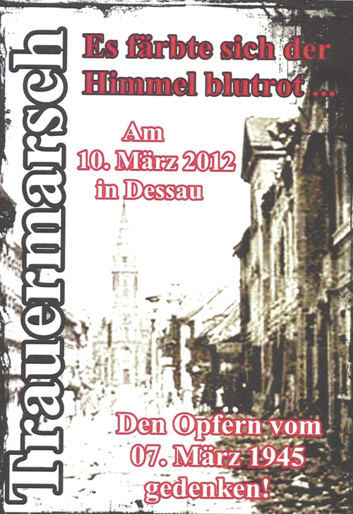 10. März 2012 / Dessau-Roßlau  Am 10. März versammelten sich auch im Jahr 2012 Anhänger der sogenannten freien Kameradschaften und NPD-Aktivisten aus der Region in Dessau-Roßlau. Wie in den vergangenen Jahren (mehr dazu hier... und hier...) hatten die Neonazis zu einem Trauermarsch aufgerufen, um in der üblichen Manier die deutsche Kriegsschuld zu leugnen, vermeintlichen deutschen Helden zu gedenken und den Alliierten Kriegsverbrechen im Zweiten Weltkrieg vorzuwerfen. Allerdings scheinen auch die Neonazi-Kameraden kein sonderlich großes Interesse an dieser jährlichen Trauerfarce mehr zu haben, so fanden sich nochmals weniger Aktivisten als in den vergangenen Jahren ein. |