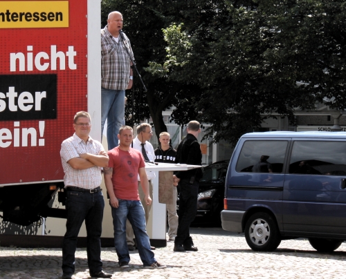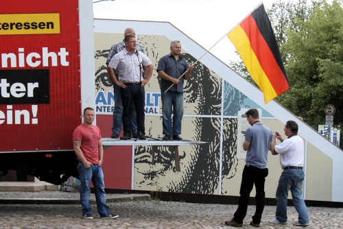 8. August 2012 / Dessau-Roßlau Im Rahmen ihrer sogenannten Sommertour machten die Aktivisten der rechtsextremen NPD auch in Dessau-Roßlau Station. Am 8. August kurz nach 11 Uhr traf der kleine Tross der Partei auf dem Schloßplatz in Dessau-Roßlau ein. Empfangen wurden der Bundesvorsitzende der NPD, Holger Apfel, und einige andere, mehr oder weniger prominente Parteifunktionäre (wie Matthias Faust und Jörg Hähnel), durch den lokalen NPD-Akteur Thomas Greye. ![]() Matthias Faust bei seiner Rede. Nach kurzer Musikbeschallung redeten Matthias Faust und im Anschluss dann Holger Apfel. Entsprechend des Mottos der Parteirundreise, Raus aus dem Euro, agitierten beide Redner massiv gegen die europäische Gemeinschaftswährung. Insbesondere Holger Apfel ließ es sich zudem nicht nehmen, zahlreiche weitere Bestandteile rechtsextremer Verschwörungstheorien mit in seiner Rede unterzubringen. Von den ominösen bösen Kräften des „internationalen Finanzkapitals“ über die vermeintlich bevorstehende Islamisierung Deutschlands bis zur üblichen „Ausländer Raus“ Rhetorik fand alles Platz in der rechtsextremen Propagandarede. ![]() Holger Apfel, NPD-Vorsitzender, (Ladefläche links) als Agitator mit Schwarz-Rot-Gold Die NPD versucht seit einigen Monaten aus den wirtschaftlichen und finanziellen Problemen innerhalb des Euroraumes politisches Kapital zu schlagen. Im Zuge dieser Bemühungen wurden bereits mehrfach Infostände und Kundgebungen abgehalten (mehr hier... und hier...). |