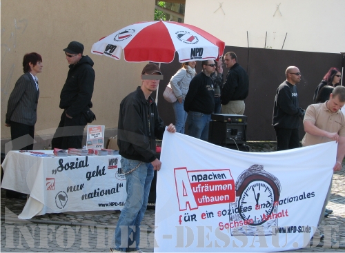 30. März 2009 / Wittenberg Vor wenigen Tagen verkündeten Polizei und Staatsanwaltschaft in einem Pressegespräch, dass der „Feuerteufel von Wittenberg“ endlich gefasst worden ist. Die Ermittlungsbehörden vermuten, dass der dringend tatverdächtigen 19-Jährige für insgesamt 50 Brandstiftungen im Bereich Wittenberg verantwortlich ist. Nach Informationen des Projektes GegenPart handelt es sich bei dem mutmaßlichen Täter um den Neonaziaktivisten Markus F. aus Wittenberg. Der 19jährige kann seit mehr als zwei Jahren zum aktiven Teil der rechten Szene zugeordnet werden und nahm so regelmäßig an Veranstaltungen der NPD und des neonazistischen Kameradschaftsspektrums teil. ![]() Markus F. (Bildmitte), am NPD-Infostand am 03. Mai 2008 Gräfenhainichen (mehr dazu hier...) ![]() der mutmaßliche Tatverdächtige am 23. August 2008 iauf einem Neonaziaufmarsch in Quedlinburg (mehr dazu hier...) Zehn dieser Straftaten habe der junge Mann bereits eingeräumt. Der geschätzte Sachschaden beläuft sich nach Polizeiangaben annähernd auf eine Million Euro. In der Nacht zum 18. März 2009 ereigneten sich zum Beispiel allein fünf Brände binnen einer Nacht, bei einem dieser Brände erlag ein 27-jähriges Opfer seinen Verletzungen. Markus F. beteiligte sich seit 2007 an mehreren NPD-Infoständen in der Region Anhalt, so zum Beispiel am 01. Mai 2007 in Wittenberg (mehr dazu hier...) und 03. Mai 2008 in Gräfenhainichen. Auf zahlreichen regionalen und überregionalen Demonstrationen konnte er zudem als Träger rechtsextremer Banner und Fahnen identifiziert werden. Bei einem Neonaziaufmarsch am 07. März 2009 in Dessau-Roßlau, spielte Markus F. darüber hinaus bei der Choreographie einer so genannten Trauerzeremonie eine tragende Rolle. In Wittenberg ist Markus F. für rechtsextreme Propagandadelikte und Sachbeschädigungen sowie Bedrohungen gegen alternative Jugendliche einschlägig bekannt. Ferner soll sich der Tatverdächtige in Vergangenheit mehrfach gegenüber Zeugen gebrüstet haben, dass er so genannte „Anti-Antifa-Listen“ führen würde. In solchen Dateien sammeln Neonazis personenbezogene Daten von politischen Gegnern (Gewerkschafter, Kommunalpolitiker etc.) und veröffentlichen diese beispielsweise in passwortgeschützten Internetforen (mehr dazu hier...) und (hier...). Quelle: eigener Bericht |