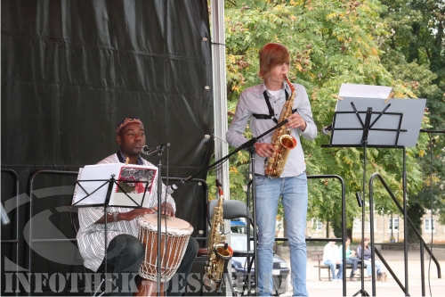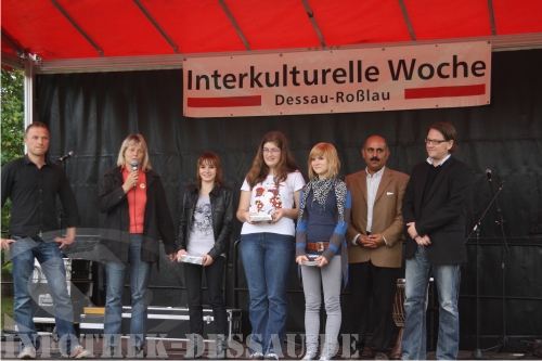 Im Vorfeld der Interkulturellen Woche ist ein Motiv-Wettbewerb zum Thema „Micsh mit!“ unter Schülerinnen und Schülern am Dessauer Philanthropinum ausgelost worden. Die drei ersten Plätze wurden auf der Bühne mit Preisen prämiert. Das Siegermotiv der 15-jährigen Marie zierte in diesem Jahr Plakate und Begleithefte zur Veranstaltungswoche. Auf dem „Markt der Möglichkeiten“ präsentieren sich in diesem Jahr Kooperationspartner im Ansinnen für Weltoffenheit und Toleranz auf der Stadtparkwiese, wo auch eine Gruppe polnischer Gastschülerinnen und Schüler den direkten Austauschen mit Dessau-Roßlauer Jugendlichen ganz praktisch und gemütlich suchen.