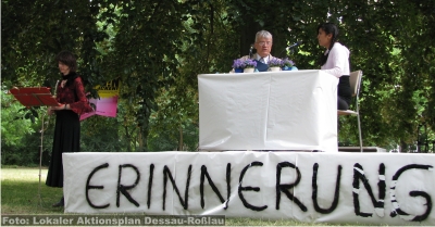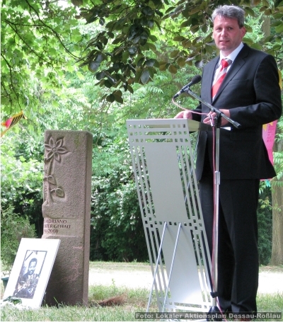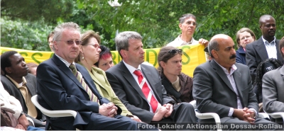„Und wir alle wissen: Mord ist für Nazis kein Betriebsunfall.“"Woche der Erinnerung" in Gedenken an Alberto Adriano im Dessauer Stadtpark “Die Stühle sind dafür da, sich zu setzen“, bittet Moderator Joachim Landgraf die rund 100 Gäste, die zum Auftakt der „Woche der Erinnerung“ am 11. Juni in den Dessauer Stadtpark gekommen sind, Platz zu nehmen. Die Anwesenden schauen dabei immer wieder in den Himmel der Muldestadt, dort grummelt und donnert es. Doch das herannahende Gewitter zieht weiter und es bleibt trocken. Eine nahezu stürmische Erweiterung hat in diesem Jahr auch das Gedenken an Alberto Adriano genommen. Erstmals hat sich der Vorbereitungskreis unter Federführung des Multikulturellen Zentrums (mehr dazu hier…), dem darüber hinaus u. a. das Anhaltische Theater, die Stiftung Bauhaus, das Dessau-Roßlauer Bündnis gegen Rechtsextremismus, der Evangelische Kirchenkreis und das Polizeirevier angehören, dazu entschlossen, mit einer „Woche der Erinnerung“ die Ermordung des Mosambikaners vor acht Jahren zurück ins Gedächtnis der Stadt zu rufen. Das Projekt, vom Lokalen Aktionsplan für Demokratie und Toleranz unterstützt (mehr dazu hier…), ist dabei mehr als eine konzeptionelle Erweiterung des bisher alljährlich auf die Beine gestellten Begegnungstages (mehr dazu hier…) und. ![]() Durch andere Präsentationsformen, künstlerische Elemente und einer verstärkten Kooperation mit hiesigen Kulturinstitutionen, sollen andere Zugänge gefunden werden um damit nicht zuletzt die Wirkungsmächtigkeit des Gedenkens im lokalen Diskurs erhöht werden. Es geht den Organisatoren auch darum, die Debatte um Alltagsrassismus und rechte Gewalt weiter zu führen, auch und gerade in einem lokalen Bezugsrahmen. Denn diese Phänomene sind der anhaltischen Wirklichkeit nach wie vor immanent (mehr dazu hier…) und leider keine Entwicklungen, die um die Jahrtausendwende zum Stillstand gekommen wären. Das schätzt offensichtlich auch der Verwaltungsdirektor des Anhaltischen Theaters so ein. „Die Brutalität rechter Gewalt nimmt zu und unsere Zivilgesellschaft gerät in Gefahr.“, sagt Joachim Landgraf, der sich von Anfang an für die Initiative stark gemacht hat. Er ruft dazu auf, „im kleinen Kreis wie im Großen nicht zu zulassen“, dass rechtes Gedankengut weiter hoffähig wird. Bei der geplanten Umgestaltung des Stadtparkes müsse zudem darüber nachgedacht werden, wie man sich im Rahmen einer Erinnerungs- und Gedenkkultur mit dem Mord an Alberto Adriano auseinandersetzte. Landgraf versteht die Anwesenheit des Innenministers Holger Hövelmann ausdrücklich als Würdigung der Veranstaltung. ![]() Joachim Landgraf führt durch das Programm der Auftaktveranstaltung Doch bevor der SPD-Landesvorsitzende ans Mikro tritt, rappt die Hip Hop-Crew „G-Records“ in selbiges. Die interethnische Band, die sich aus Schülern mit und ohne Migrationshintergrund des Dessauer Philantropinums zusammensetzt, hat einen jugendkulturellen Zugang zum Thema, in der Sprache manchmal derb, aber dennoch erfrischend offen: „Wir wissen alle warum wir hier sind, es war feige ihn umzubringen.“ ![]() Rappen gegen Fremdenfeindlichkei: die Dessauer Hip Hop-Crew "G-Records" “Das war ein Schock für diese Stadt und dieses Land und ist es immer noch.“, beginnt Holger Hövelmann seinen Beitrag. Der Innenminister hat die Bekämpfung des Rechtsextremismus öffentlich zur Chefsache erklärt und lässt auch heute an dieser Prämisse keinen Zweifel: „Es strafft alle die Lügen, die den Rechtsextremismus immer noch als aufgebauschtes Problem ansehen.“ Wenig später wird er neu deutlicher: „Und wir alle wissen: Mord ist für Nazis kein Betriebsunfall.“ Hövelmann fordert eine Ächtung des Rassismus und im Umkehrschluss zugleich einen Integrationsprozess ein, an dem alle – nicht nur die Politik- aktiv mitarbeiten müssten. Der Fall Adriano zeige aber auch, dass nicht immer weggeschaut werde. Mehrere Bürger hätten so in der Tatnacht unabhängig voneinander die Polizei verständigt. Auf eine „Bereitschaft hinzugucken und auszusagen“ komme es an. Hövelmann sagt auch, dass die Polizei im Fall Alberto Adriano nichts falsch gemacht habe. Damit spielt der oberste Dienstherr aller Polizisten im Land augenscheinlich auf Ermittlungspannen und Versäumnisse bei der Bekämpfung rechtsextremer Straf- und Gewalttaten in Sachsen-Anhalt an, die in den letzten Monaten für eine breite öffentliche Debatte sorgten und mit denen sich im Landtag mittlerweile ein Parlamentarischer Untersuchungsausschuss befasst (mehr dazu hier…). ![]() Innenminister Holger Hövelmann will im Kampf gegen Rechts nicht nachlassen Der SPD-Politiker spart ein heikles Thema, gerade in Dessau-Roßlau, nicht aus: „Ich hoffe, dass ein Rechtsfrieden auch vom Urteil im Fall Oury Jalloh ausgeht.“ Seit März letzten Jahres sitzen vor dem Landgericht zwei Polizeibeamte auf der Anklagebank den vorgeworfen wird, durch Unterlassung für den Tod Oury Jallohs in einer Dessauer Polizeizelle mitverantwortlich zu sein. Der Asylbewerber verbrannte im Januar 2005 unter bisher ungeklärten Umständen, war an Händen und Füssen gefesselt und soll dabei mit einem Feuerzeug den Brand selbst entfacht haben (mehr dazu hier…). „Eins Strafbonus für Polizeibeamte darf es ebenso wenig nicht geben, wie eine Vorverurteilung.“, mahnt Hövelmann an. “Sind den alle dummen Leute Rassisten?“, fragt May Minhel den Schauspieler Rainer Böhm der antwortet: „Nein, aber alle Rassisten sind dumm!“ Dieser Dialog gehört zur szenischen Lesung aus dem Buch „Papa, was ist ein Fremder?“ des preisgekrönten Autors Thar Ben Jellun. Die Adaption dieses antirassistischen Jugendbuches wird den Stadtpark noch bis zum Ende der „Woche der Erinnerung“ beschallen. ![]() May Minhel und Rainer Böhm lesen aus dem Buch "Papa, was ist ein Fremder?" Zum Schluss der Auftaktveranstaltung kommt eine Freundin Alberto Adrianos aus der afrikanischen Community zu Wort: 