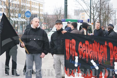 Indes haben 50 Rechtsextremisten aus der Region Anhalt und dem sächsichen Schkeuditz auf einer Kundgebung im Stadtzentrum am gestrigen Donnerstag (05. März 2009), ihre geschichtsrevisonistischen Mätzchen abgezogen und damit die Verbrechen des nationalsizialistischen Terrorregimes geleugnet. Ein Vorgeschmack auf das, was von der zynisch als "Trauermarsch" deklarierten rechtsextremen Demo am Samstag zu erwarten ist.