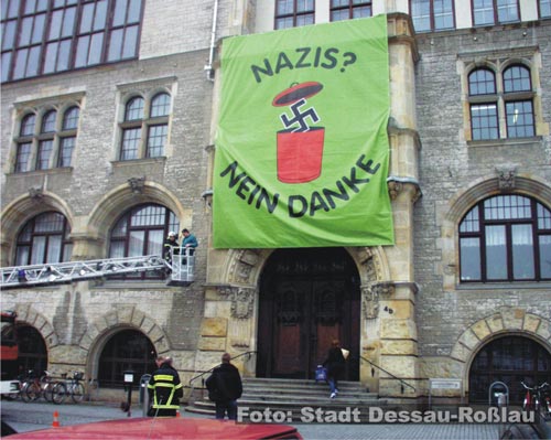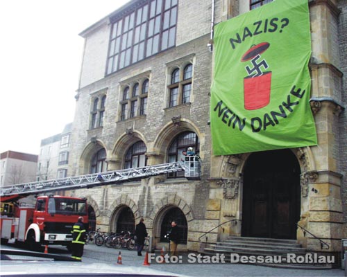 Der breitgetragene Protest gegen einen Naziaufmarsch am 07. März 2009 in Dessau-Roßlau, nimmt in der Doppeltstadt immer konkreter Formen an. Nachdem die geplante Demonstrationsroute der Rechtsextremisten in den vergangenen Tagen bereits demokratisch markiert wurde (mehr dazu hier...), flattert nun auch aus dem Rathaus eine deutliche Botschaft: "Nazis? Nein Danke!".