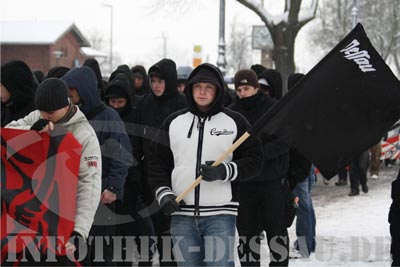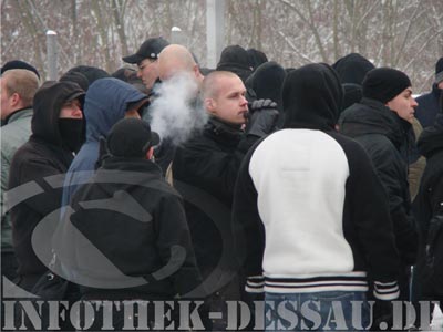 30. Dezember 2009 / Gardelegen / Dessau-Roßlau / LK Anhalt-Bitterfeld / LK Wittenberg Etwa 180 Neonazis aus Sachsen-Anhalt, Sachsen und Niedersachsen marschierten am 30.Dezember 2009 durch Gardenlegener Innenstadt. Der Aufmarsch ist die mittlerweile traditionelle "Jahresabschlussdemonstration" in der Altmark. Unter dem Motto: "Demokratie gleich Volkstod" nahmen an der extrem rechten Veranstaltung auch Neonazis der Region Anhalt teil. 300 Menschen, darunter der Innenminister des Landes Sachsen-Anhalt Holger Hövelmann, protestierten friedlich gegen den Aufmarsch. ![]() Dessauer Neonazi-Aktivist Pierre K. auf der Demonstration Werbung für den vom NPD-Kreisvorsitzenden Kai Belau im Namen der „Freien Kräfte aus der Altmark“ angemeldeten Aufmarsch suchte man im Vorfeld des Termins vergeblich. In Redebeiträgen wurde der Wunsch nach einer deutschen Volksgemeinschaft zelebriert, sowie eine Absage an die Moderne. Aus der Region Anhalt nahmen an dem Aufmarsch Neonazis aus Dessau-Roßlau, Anhalt-Bitterfeld und dem Landkreis Wittenberg teil. ![]() Alexander W, aus Dessau, während einer Kundgebung Quellen: Infothek Dessau eigener Bericht |