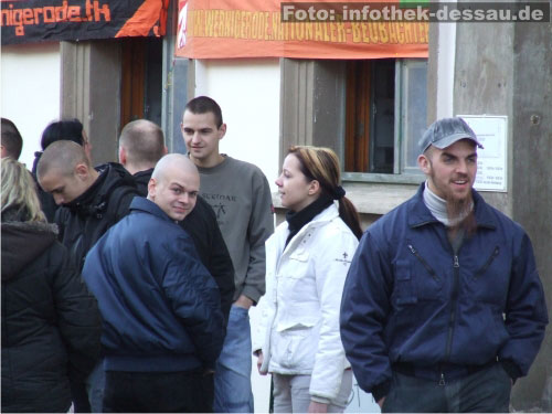 10. Juli 2011 / Dessau-Roßlau Am Rande eines Sommerfestes des Alternativen Jugendzentrums (AJZ) kommt es zu einer Provokation des bekennnenden Neonazis Martin V. Der Rechtsextremist und ehemalige Aktivist der Kameradschaft "Freie Nationalisten Dessau", der zudem vor 3 Jahren an einem versuchten Angriff auf das AJZ beteiligt war (mehr dazu hier...), taucht im Vereinscafe "Panic Room" auf und trägt dabei ein T-Shirt einer in der rechten Szene beliebten Modemarke. Schließlich wird er auf Grundlage des Hausrechts und der Vereinssatzung des Jugendzentrums verwiesen. ![]() Martin V. (r.) auf einer rechtsextremen Kundgebung im März 2011 in Bernburg Quelle: eigener Bericht |