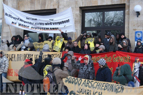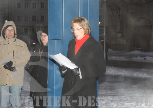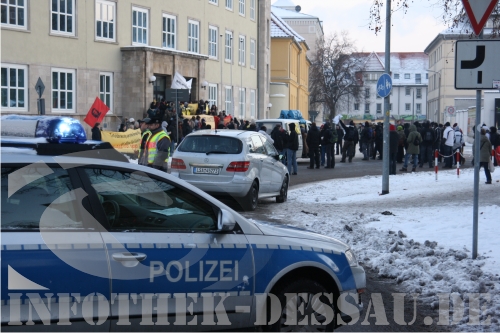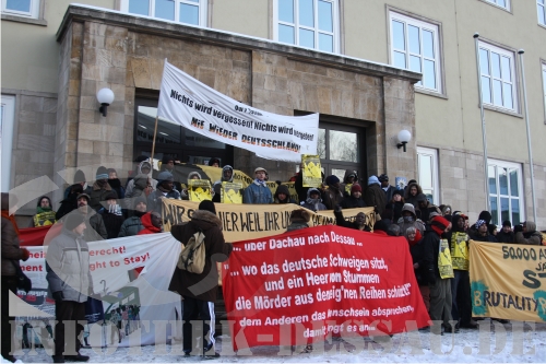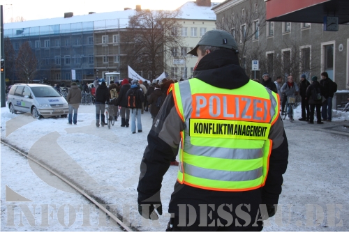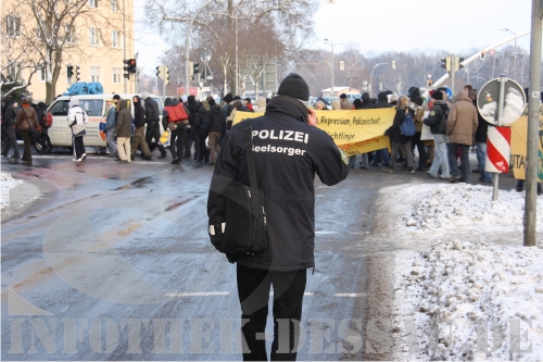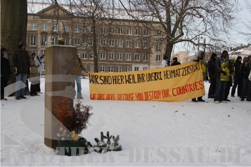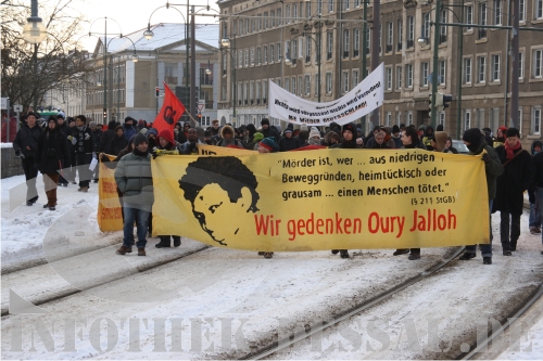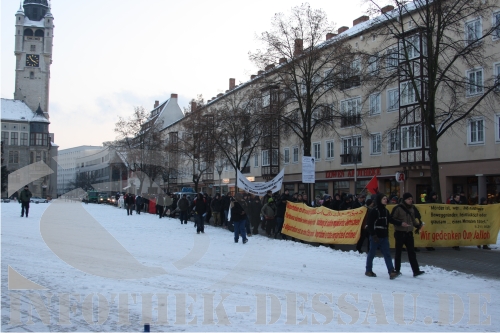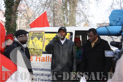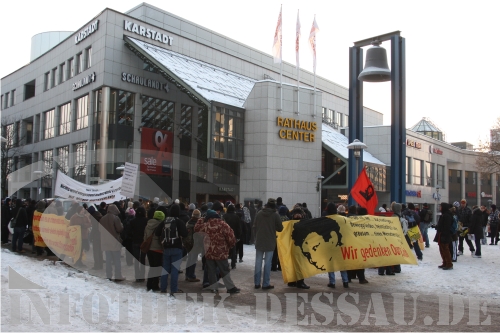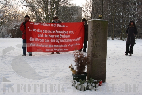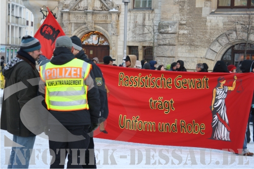 „Für uns sind nicht nur die Angeklagten Mörder sondern alle Polizisten, die am 07. Januar 2005 im Polizeirevier anwesend waren.“Dessau-Roßlau erinnert an den qualvollen Tod Oury Jallohs // Demonstranten üben erneut harsche Kritik an der Polizei, der Justiz und der Zivilgesellschaft Die Stadt Dessau-Roßlau rief am 07. Januar 2009 zu einer Mahnwache auf, MigrantInnenselbstorganisationen und antirassistische Gruppen mobilisierten zu einer Demonstration. Anlass dieser verstärkten Aktivitäten zum Jahresbeginn war der 4. Todestag Oury Jallohs. Der Mann aus Sierra Leone verbrannte damals - an Händen und Füssen gefesselt - in einer Dessauer Polizeizelle. Doch trotz dieser zeitlichen und räumlichen Nähe hätten die politischen Forderungen und Schlussfolgerungen die an diesem Tag gezogen wurden, differierender wohl kaum sein können. Während an der Friedensglocke 50 BürgerInnen der Stadt Anteil am Schicksal Oury Jallohs nahmen und für Weltoffenheit und Toleranz plädierten, kritisierten die 150 Demonstrationsteilnehmer die juristische Aufarbeitung des Falles als „Scheinprozess“, sprachen von einem Mord in der Polizeizelle und forderten zudem die Einsetzung einer unabhängigen Expertenkommission, die den Tod des Asylbewerbers untersuchen soll. Mittwoch, der 07. Januar 2009 pünktlich 08.00 Uhr: Rund 50 Menschen versammeln sich bei klirrender Kälte an der Friedensglocke, um an den Tod Oury Jallohs vor genau vier Jahren zu erinnern. Zu der Mahnwache im Stadtzentrum hat Oberbürgermeister Klemens Koschig aufgerufen. Gekommen sind neben einer handvoll Stadträte, u.a. der Leiter des Polizeireviers, Wolfgang Berger, der Dessauer Polizeipräsident Karl-Heinz Willberg und Oberstaatsanwalt Christian Preissner, der die Anklagebehörde im Oury Jalloh-Prozess vertritt (mehr dazu hier…). Die arktischen Temperaturen verhindern nicht nur, dass wie geplant die Glocken des symbolträchtigen Mahnmals erklingen. Die Technik der Friedensglocken hat genau so den Geist aufgegeben, wie der Wagen des Oberbürgermeisters. Klemens Koschig steckt noch in Roßlau fest und wird von der Finanzdezernentin Sabrina Nußbeck vertreten. ![]() Die verliest in handgestoppten 120 Sekunden die Erklärung der Stadt. Darin wird das Bedauern über die tragischen Umstände, die zum Tod Oury Jallohs führten, zum Ausdruck gebracht. Die Stadtvertreterin geht in ihrem Kurzstatement noch auf einen anderen Aspekt des Falles ein, der insbesondere nach der als gescheitert zu betrachtenden juristischen Aufarbeitung im Jalloh-Prozess (mehr dazu hier…), aktueller denn je erscheint und die öffentliche Debatte nach wie vor prägt: „Die Geschehnisse um den schrecklichen Tod bieten Raum für Mutmaßungen, Verdächtigungen und Misstrauen in der Stadt. Damit belasten diese schrecklichen Ereignisse das Zusammenleben zwischen Einheimischen und Zugezogenen in hohem Maße.“ Oberbürgermeister Klemens Koschig hatte dies in seinem Aufruf zum Gedenken noch stringenter formuliert: „So sehr sich die Justizbehörden auch mühten, es gibt keinen Abschluss, der den Tod von Oury Jalloh erklärbar macht.“ Nußbeck ist sich dennoch sicher, das sich viele BürgerInnen der Stadt schon jetzt aus „tiefster menschlicher Überzeugung“ für ein friedliches und kreatives Miteinander einsetzen würden. Sie schließt mit dem Appell: „Lassen Sie uns gemeinsam für eine friedliche Zukunft unserer Stadt, geprägt von Weltoffenheit und Toleranz, eintreten.“ ![]() Finanzdezernentin Sabrina Nußbeck ruft dazu auf, Dessau-Roßlau weltoffener und toleranter zu gestalten Während viele Beobachter und Teilnehmer der Mahnwache die symbolische Geste, die die Stadt mit diesem ersten offiziellen Erinnern setzte, durchaus zu würdigen wussten, wurde indes auch Kritik laut. Nicht nur am frühen Beginn der Veranstaltung, sondern auch am Ort und dem Rahmen des Gedenkens. Eine Sprecherin einer Migrantenselbstorganisation der Stadt bestätigte auf gegenPart-Nachfrage, dass man sich in einem bilateralen Gespräch mit dem Oberbürgermeister im Vorfeld der Veranstaltung darauf verständigt habe, dass Erinnern am oder im Polizeirevier stattfinden zu lassen. Diesen zweifellos angebrachten Rahmen, insbesondere was die Orts- und Anlassbezogenheit anbelangt, setzten lokale AkteurInnen bereits im letzten Jahr um - und er stieß fast durchgängig auf positive Resonanz. Nach gegenPart-Informationen, verweigerte der Hauptausschuss der Stadt diesem Konzept allerdings in diesem Jahr seine Zustimmung. ![]() Teilnehmer des Gedenkens an der Dessauer Friedensglocke Szenenwechsel. Mittwoch, 07. Januar 2009, Bahnhofsvorplatz: Mit einstündiger Verspätung setzt sich die 150 Teilnehmer der Demonstration „Break the Silence“ in Bewegung. Zu dem Aufzug, den die „Initiative in Gedenken an Oury Jalloh“ durchführt, sind neben Aktivisten der Black Community aus Berlin, Hamburg und Jena, auch antirassistische Gruppen aus der Hauptstadt, zwei Dutzend alternative Jugendliche aus der Region, die „Deutsch-Afrikanische Initiative Dessau“ und die „Socialist Party of Iran“ erschienen. Die Polizei, die mit einem massiven Aufgebot aus Landesbereitschaftspolizei, Bundespolizei und Staatsschutzbeamten präsent ist, hält sich in der Folge augenscheinlich im Hintergrund. Zu nennenswerten Zwischenfällen sollte es nicht kommen. ![]() hatten nicht viel zu tun: die Deeskalationsteams der Polizei Schon eine oberflächliche Analyse der mitgeführten Schilder und Meinungsäußerungen zeigt offensichtlich, dass die ProtagonistInnen heute nicht mit einer überschwänglichen Dialogbereitschaft nach Dessau gekommen sind. Fundamentalkritik, die erst gar nicht den Anschein einer differenzierten Betrachtung aufkommen lassen wollte, sei es am deutschen Rechts- und Justizsystem, am institutionellen Rassismus oder am gescheiterten Oury Jalloh-Prozess, stehen im ausschließlichen Fokus. Man spürt förmlich die emotional aufgeladene Stimmung, die mit ohnmächtiger Wut und einem Entsetzten darübe
