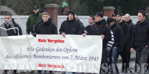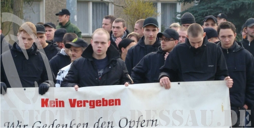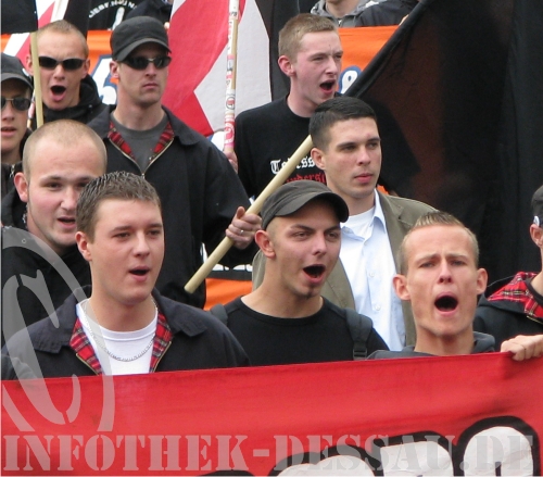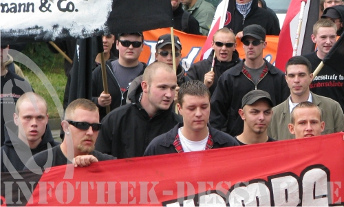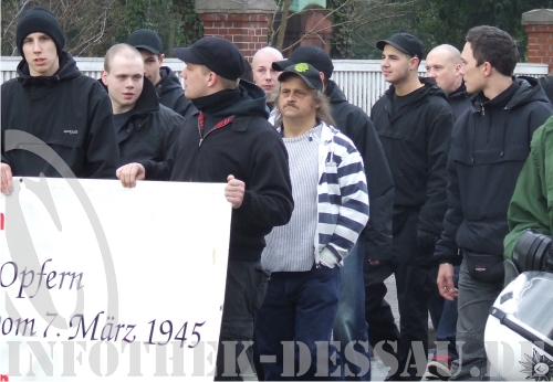 Angeklagter Dennis L. (Bildmitte) auf der Neonazidemonstratin am 08.März 2008 in Dessau-Roßlau (mehr dazu hier...)