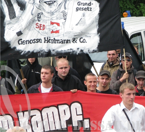 Nach der Mittagspause offeriert die vorsitzende Richterin Haferland, dass auch der Zeuge Emanuel Str. nicht vorgeführt werden könne, dessen Mutter habe gesagt, er hätte die Zeugenvorladung nicht erhalten. „Die Postzustellungsurkunde spricht ein anderes Bild.“, so die Vorsitzende dazu. Auch er bekommt ein Ordnungsgeld in Höhe von 100 Euro auferlegt und wird zum nächsten Verhandlungstermin polizeilich vorgeführt. Rechtsanwalt Ränsch beantragt für sich und seinen Mandanten, den Angeklagten Kevin A., eine Beurlaubung, da die weiteren Punkte, die heute Thema sein sollen, diesen nicht mehr betreffen. Beide verlassen den Verhandlungssaal.  am Transparent: Zeuge Thomas G. (1.v.li.) und angeklagter Robert Z. auf der Neonazidemonstration gegen Innenminister Holger Hövelmann am 14.Juni 2008 in Zerbst (mehr dazu hier...)