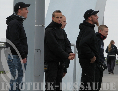 Stephan J. erscheint ebenfalls nicht ladungsgemäß und erhält ein, wie bereits manch andere an diesem Tag, ein Ordnungsgeld auferlegt. Als nächstes betritt der 19-jährige Thomas G. den Zeugenstand. „Wir haben uns gesehen, aber mehr kann ich dazu nicht sagen.“, gibt der Zeuge auf die Frage hin zu Protokoll, ob er mit den Angeklagten Robert Z. und Dennis L. an diesem Tag zusammen unterwegs gewesen sei. Von einer Schlägerei an diesem Tag wisse er nichts. Ebenfalls hinsichtlich der Frage nach einer „Anmache“ wegen eines T-shirt-Aufdrucks, antwortet der Zeuge: „Das sind jetzt wieder Fragen – Ich weiss es nicht.“  Angeklagter Dennis L. (2.v.re.) und Prozessbesucher Thomas L. (1.v.re.) sowie Steffen M. (1.v.li.) auf der Neonazidemonstrtation am 08.März 2008 in Dessau-Roßlau (mehr dazu hier...)