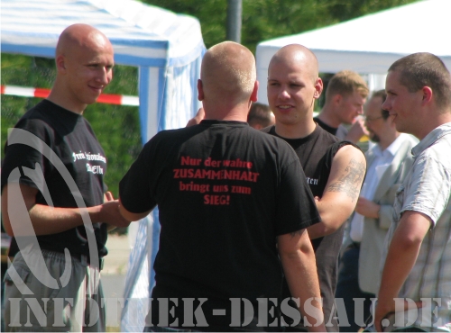 02. August 2008 / Dessau-Roßlau Heute gegen 06.30 Uhr griffen zwei Neonazis erneut das Alternative Jugendzentrum in Dessau an und zerstörten durch Steinwürfe eine Sicherheitsglasscheibe im Vereinscafé. Engagierten Vereinsmitglieder gelang es wenig später, einen der flüchtigen Täter zu stellen. Dabei nahmen sie dem Angreifer einen Teleskopschlagstock ab, fixierten ihn und übergaben ihn dann an die eintreffenden Polizeibeamten. Engagierten Vereinsmitglieder gelang es wenig später, einen der flüchtigen Täter zu stellen. Dabei nahmen sie dem Angreifer einen Teleskopschlagstock ab, fixierten ihn und übergaben ihn dann an die eintreffenden Polizeibeamten. Nach dem die couragierten Bürger die Beamten auf die Fluchtrichtung des anderen Täters hingewiesen hatten, stellte sich dieser im Bereich des Dessauer Tiergartens der Polizei. Der dort gefasste Mann ist nach Informationen des Projekt gegenPart eindeutig der rechten Szene zu zuordnen und trat als Mitglied der Neonazikameradschaft „Freie Nationalisten Aken/Elbe“ in der Vergangenheit nachweislich schon mehrmals in Erscheinung. ![]() Der Täter Robert S. (hier links im Bild), der am Übergriff beteilgt war und später im Tiergarten von der Polizei gefasst wurde. Das Foto zeigt Neonazis der "Freien Nationalisten Aken/Elbe", u. a. deren Führungsperson Christian W. (2 v. r.) beim NPD-Sommerfest 2008 in Sangerhausen (mehr dazu hier...). ![]() Hier ist der Täter, der zu den “Freien Nationalisten Aken/Elbe” zu zählen ist, rechts neben Alexander W. von den "Freien Nationalisten Dessau" (5 v. l.) zu sehen. Erst vor einer Woche griffen mutmaßliche Rechtsextremisten das Jugendzentrum, in dem u.a. das Mobile Beratungsteam gegen Rechtsextremismus und die Koordinierungsstelle des Lokalen Aktionsplanes für Demokratie und Toleranz ansässig sind, mit Steinwürfen an. Dabei gingen ein halbes Dutzend Scheiben zu Bruch (mehr dazu hier...). Der Verein hat Strafanzeige erstattet. Der polizeiliche Staatsschutz hat die Ermittlungen aufgenommen. Infos/Kontakt: ![]() |
