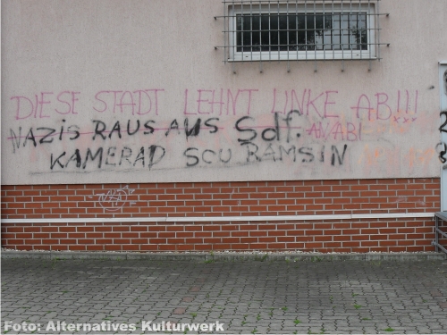 Bei den auf einer Hauswand platzierten Schmierereien wähnten sich die Urheber der Sachbeschädigung offenbar als Sprachrohr der Stadt und meinten u.a. konstatieren zu können: „Diese Stadt lehnt Linke ab!“ Im Rahmen dieser Propagandadelikte war außerdem eine „Kampfansage“ an das regionale Alternative Zentrum festzustellen. So drohten der oder die Urheber mit „AKW der Kampf beginnt“ dem „Alternativen Kulturwerk“ (AKW) im nahegelegenen Bitterfeld-Wolfen (OT Bitterfeld), das in der Region für seine Positionierung gegen Rechts bekannt ist. Der Trägerverein des AKW, das Multikulturelle Centrum e.V., besteht bereits seit 1997 und unterhält ein selbstverwaltetes Vereinsgelände am Bitterfelder Bahnhof. Auch an diesem Gelände haben rechte Straftäter in der Vergangenheit bereits neonazistische Propagandadelikte verübt (mehr dazu hier...).