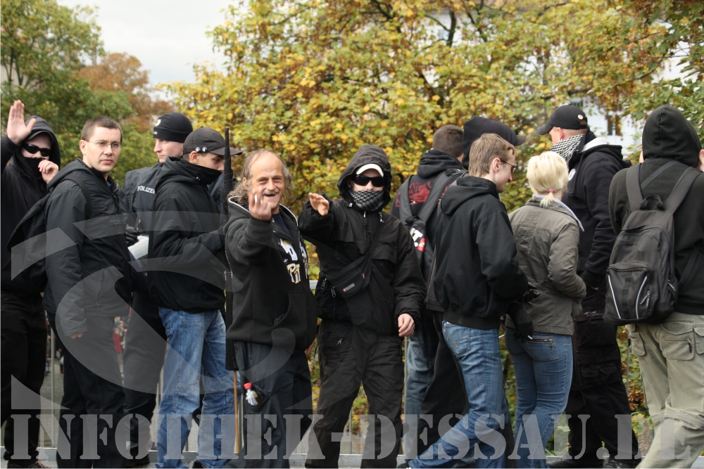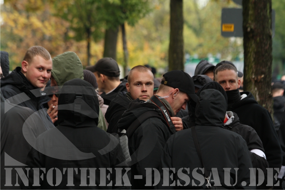 17. Oktober 2009 / Leipzig / Dessau-Roßlau An dem für den 17. Oktober 2009 in Leipzig angemledeten Aufmarsch der "Nationalen Sozialisten Leipzig" nahmen neben mehr als 1000 Teilnehmern auch Neonazis aus Dessau-Roßlau teil. Der Aufmarsch unter dem Motto: "Recht auf Zukunft" konnte nicht wie geplant von Leipzig-Sellerhausen bis zum Hauptbahnhof in der Innenstadt ablaufen. Nachdem es aufgrund mehrstündiger Verzögerungen durch friedliche Blockaden von Gegendemonstranten kam warfen Teilnehmer des Neonaziaufmarsches mit Flaschen und anderen Wurfgegenständen auf Polizeibeamte. Daraufhin löste die Polizei die Versammlung auf und stellte von nahezu allen rechten Teilnehmern die Identitäten fest.