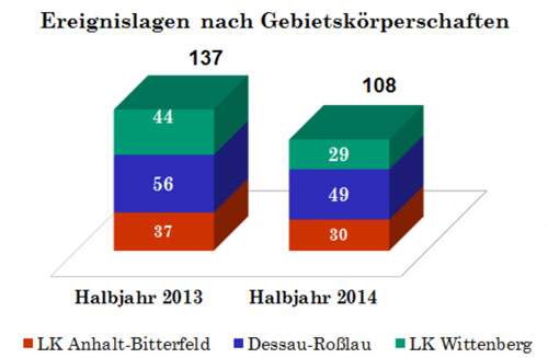 Im 1. Halbjahr 2014 wurden insgesamt 108 rechtsextreme Ereignislagen in der Region Anhalt registriert. Im Vergleich zum Vorjahreszeitraum bedeutet dies einen Rückgang um rund 20 Prozent (1. Halbjahr 2013: 137 Ereignislagen). Bei den Ereignislagen nach Gebietskörperschaften liegt auch im 1. Halbjahr 2014 Dessau-Roßlau an der Spitze – 49 Einträge (gut 45 Prozent des Gesamtaufkommens) entfallen allein auf die kreisfreie Stadt, wobei sich der Trend aus den letzten Jahren, dass sich der Abstand zu den Landkreisen Anhalt-Bitterfeld und Wittenberg in einem überschaubaren Rahmen bewegt, fortgesetzt hat. Die Doppelstadt an Elbe und Mulde führt zudem mit 5 ausgewiesenen Gewaltstraftaten die Zählung in diesem Segment mit deutlichem Vorsprung an.