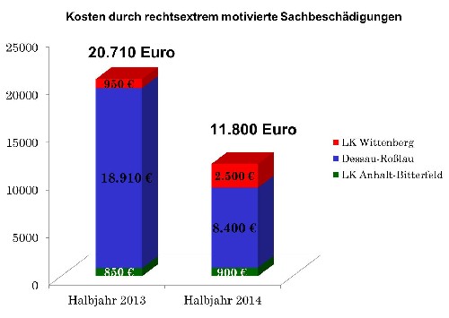 Die kreisfreie Stadt Dessau-Roßlau bleibt absoluter Schwerpunkt rechtsextrem motivierter Straftaten in der Region Anhalt. Die vom Mobilen Beratungsteam gegen Rechtsextremismus erstellte Chronik zu rechtsextremen Ereignislagen für das erste Halbjahr 2014 untermauert diesen Befund. Bei den verzeichneten Gewalttaten führt die Doppelstadt die Auszählung ebenso an, wie bei den durch Rechtsextremisten und Neonazis verursachten Sachschäden. Demnach ereigneten sich fast 45 % aller im vergangenen Halbjahr dokumentierten rechtsextremen Ereignislagen, Gewalttaten und Propagandadelikte in Dessau-Roßlau. Der Trend aus den vergangenen Jahren, dass sich dabei der Abstand zu den Landkreisen Anhalt-Bitterfeld und Wittenberg immer weiter verringert, setze sich auch in den letzten 6 Monaten fort.