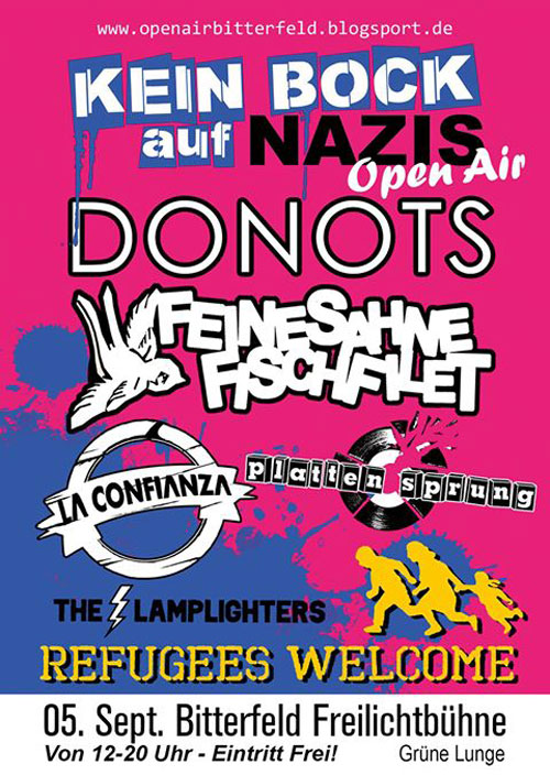 Daher laden wir euch alle, am 05. September, zu unserem „Kein Bock auf Nazis – Open Air“ auf der Bitterfelder Freilichtbühne ein. Von 12-20h wollen wir mit euch ein großes Fest der Solidarität veranstalten, bei dem das Kennenlernen und ein fröhliches Miteinander im Vordergrund stehen sollen. Wenn andere Menschen vor diffusen Ängsten, Wut und Hass fast platzen, wollen wir unser Miteinander feiern und zeigen, dass wir uns ihrer Menschenfeindlichkeit immer aktiv entgegenstellen werden!"