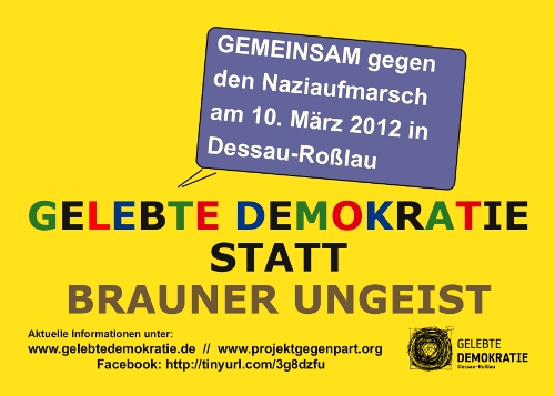 GELEBTE DEMOKRATIE STATT BRAUNER UNGEISTNetzwerk ruft zu friedlichen Protesten gegen Neonazi-Aufmarsch in Dessau auf Für den 10. März 2012 haben Neonazis aus dem Spektrum der sogenannten freien Kameradschaften eine Demonstration in Dessau-Roßlau angekündigt. Bereits in den vergangenen Jahren marschierten Rechtsextremisten rund um den 7. März auf, um anlässlich des Jahrestages der Bombardierung der Stadt im Zweiten Weltkrieg ihre geschichtsrevisionistische Weltsicht zu verbreiten (mehr hier... und hier...). Zahlreiche Initiativen, Vereine, Bildungsträger, Unternehmen und Kulturinstitutionen sowie engagierte Einzelpersonen haben sich im Netzwerk GELEBTE DEMOKRATIE zusammengefunden, um diesem braunen Aufzug einen demokratischen und friedlichen Protest entgegenzusetzten. So werden zahlreiche Kundgebungen, Mahnwachen, kulturelle Events und ein zentrales Bühnenprogramm organisiert, dabei wird das Netzwerk durch die Landeszentrale für politische Bildung Sachsen-Anhalt unterstützt. Das breite Bürgerbündnis hatte bereits im Oktober 2011 die demokratischen Kräfte der Stadt versammelt, um den Protest gegen den geplanten Bundesparteitag der neonazistischen NPD zu koordinieren (mehr hier...). Zudem machte das Netzwerk mit einer WOCHE GELEBTER DEMOKRATIE (mehr dazu hier...) auf sich aufmerksam. Aufruf im Wortlaut Gemeinsam Gesicht zeigen gegen den Neonaziaufmarsch in Dessau-Rosslau Alljährlich im März marschieren Neonazis der freien Kameradschaften in Dessau-Roßlau auf. Mit einem sogenannten Trauermarsch versuchen die Rechtsextremisten die historische Tatsache der Bombardierung der Stadt im Zweiten Weltkrieg umzudeuten und für ihre Propaganda zu nutzen. An die Stelle des Gedenkens an die Verstorbenen setzen die Neonazis ihre eigene Version der Geschichte, in der ausschließlich von deutschen Opfern die Rede ist und die wahren Verursacher des Krieges ignoriert werden. Diesen Geschichtsrevisionismus können und werden wir nicht unwidersprochen durch die Straßen ziehen lassen. Die Erinnerung an die Verbrechen in der Zeit des Nationalsozialismus ist Voraussetzung für eine kritische Aufarbeitung der Geschichte und damit Bedingung für eine demokratische Gesellschaft. Nicht zuletzt die schrecklichen Erkenntnisse im Zusammenhang mit der Neonazi-Terrorzelle und den Aktivitäten des Nationalsozialisten Untergrundes machen erneut in tragischer Weise deutlich, wie wichtig es war und bleibt, gegen diesen menschenverachtenden Hass einzustehen. Ein demokratisches und tolerantes Gemeinwesen kann nicht ohne engagierte Menschen bestehen, die sich für die Belange Aller einsetzten. Deshalb rufen wir alle Bürgerinnen und Bürger dazu auf, am 10. März 2012 Gesicht zu zeigen und damit gemeinsam für eine freie, offene und vielfältige Stadt einzutreten. Zusammen wollen wir friedlich, bunt und kreativ gegen die Neonazis und ihre Propaganda demonstrieren. Netzwerk GELEBTE DEMOKRATIE Dessau-Roßlau im Januar 2012 Service Den Aufruf können Sie hier... als Pdf-Datei herunterladen. Die Postkarte mit dem Aufruf finden Sie hier... Ein Formular um gedruckte Exemplare der Postkarte für die Mobilisierung zu bestellen, kann hier... heruntergeladen werden. Information/Kontakt ![]() Netzwerk GELEBTE DEMOKRATIE Steffen Andersch Tel.: 0340 - 26 60 213