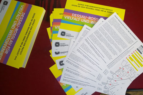 Die Protestflyer für die Gegenaktionen zur rassistischen GIDA-Regional Demo am 28. August durch die Dessauer Innenstadt sind eingetroffen und können ab sofort bestellt werden. Kontaktdaten und Bestellformulare sind in diesem Beitrag weiter unten unter SERVICE zu finden.