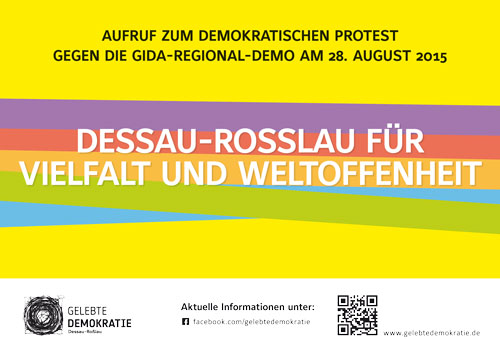 Das wollen und werden wir nicht hinnehmen: Gemeinsam wollen wir ein Zeichen für ein buntes, vielfältiges und weltoffenes Dessau-Roßlau setzen. Das Netzwerk GELEBTE DEMOKRATIE ruft daher zusammen mit zahlreichen Vereinen, Initiativen, Kirchengemeinden und engagierten Einzelpersonen zu Protestaktion DESSAU-ROSSLAU FÜR VIELFALT UND WELTOFFENHEIT