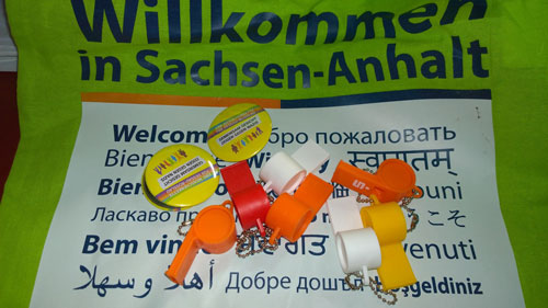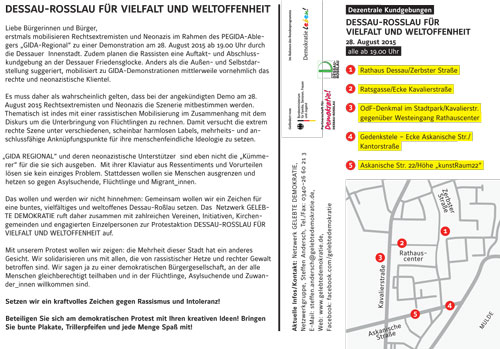 Wer Interesse an diversen Protestutensilien wie Trillerpfeifen, "Bunt statt Braun"-Button oder einem Willkommens-Stoffbeutel des Netzwerks GELEBTE DEMOKRATIE hat, kann diese ab 18.30 Uhr vor dem Rathaus (Infostand des Netzwerks vor dem Haupteingang) abholen. Alle fünf geplanten Protestkundgebungen gegen die rassistische Demonstration am 28. August 2015 (alle ab 19.00 Uhr) sind versammlungsrechtlich angemeldet und genehmigt. Bei der Kundgebung vor dem Rathaus wird zudem Oberbürgermeister Peter Kuras ab 19.00 Uhr ein kurzes Statement abgeben. Überdies hat das Multikulturelle Zentrum eine Protestdemonstration angemeldet, die auch genehmigt ist. Diese beginnt ab 18.00 Uhr vor dem Multikulturellen Zentrum (Parkstr. 07) und endet gegen ca. 18.45 Uhr im Dessauer Stadtpark. Weitere, aktuelle Informationen finden Sie weiterhin hier, auf www.gelebtedemokratie.de, www.facebook.com/gegenpart und www.facebook.com/gelebtedemokratie update 3 - mehrsprachiger Aufruf des Multikulturellen Zentrums Der Aufruf zur Demonstration des Multikulturellen Zentrums Dessau steht jetzt auch in arabisch, englisch und französisch zur Verfügung