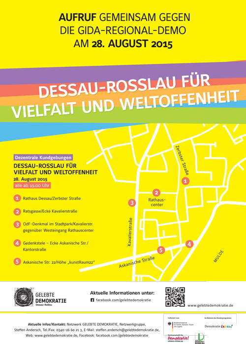 "Setzen wir ein kraftvolles Zeichen gegen Rassismus und Intoleranz! Beteiligen Sie sich am demokratischen Protest mit Ihren kreativen Ideen! Bringen Sie bunte Plakate, Trillerpfeifen und jede Menge Spaß mit!" Netzwerk Gelebte Demokratie Weitere Informationen zu den Protesten am Freitag werden aktualisiert hier und auf der Homepage vom Netzwerk Gelebte Demokratie sowie auf facebook (Projekt GegenPart und Netzwerk Gelebte Demokratie) zu finden sein. update 1 - Aufruf des Netzwerkes Gelebte Demokratie Dessau-Roßlau für Vielfalt und Weltoffenheit