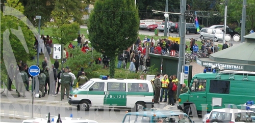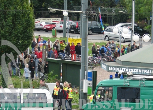 Neben der Begrüßung von Gästen war die Intension dieser Veranstaltung natürlich auch, den Neonazis, die sich wenige Meter entfernt auf dem angrenzenden Busbahnhof sammelten, zu zeigen, dass Intoleranz und Menschenfeindlichkeit im weltoffenen Dessau-Roßlau wiederum nicht willkommen sind. Bis 12.00 Uhr waren es bereits mehr als 100 Menschen, die sich dort versammelten und einerseits mit Transparent und Flugblättern für den Gedanken des Interkulturellen Stadtparkfestes warben und andererseits zumeist jüngeres, alternatives Publikum, die mit Lautsprecheranlage und Sprechchören lautstark Stimmung gegen die Neonazis machten.