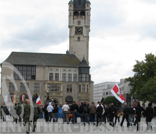 "Wir wollen euch nicht hier haben, nicht in Dessau, nicht in Magdeburg, nicht in Leipzig." mit 300 Teilnehmern größter Neonaziaufmarsch für Dessau-Roßlau // demokratischer Protest sorgt für positive Stimmung in der Stadt Am 20. September 2008 veranstalteten rechtsextreme Gruppierungen einen Aufmarsch in Dessau-Roßlau. Die mittlerweile dritte Neonazi-Demonstration in der Doppelstadt an der Mulde für dieses Jahr war mit 280 bis 300 Teilnehmern sogleich die größte, die bisher im Stadtgebiet stattgefunden hat. Mehr als 400 Menschen positionierten sich im Stadtgebiet gegen die menschenfeindliche Ideologie, die die NPD und Neonazikameradschaften an diesem Tag öffentlichkeitswirksam versuchten auf der Straße zu vermitteln.  Neonaziaufmarsch beim Start