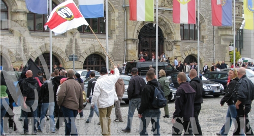 Über 3.000 Einwohnerinnen und Einwohner Sachsen-Anhalts haben afrikanische Wurzeln – so wie die restlichen 2,4 Millionen Sachsen-Anhalter, bei denen diese Wurzeln nur etwas länger zurück liegen. Neonazis, die Propagandisten der Ungleichwertigkeit der Menschen, müsse entschieden entgegen getreten werden, forderte Hövelmann. Diese sind Feinde jeglichen friedlichen Zusammenlebens und ihr Auftreten gegen Gewalt benennt der Innenminister klar als Heuchelei. "Wir wollen euch nicht hier haben, nicht in Dessau, nicht in Magdeburg, nicht in Leipzig.", so Hövelmann an die Adresse der Rechtsextremen.  Holz, W. und Thomas Wulf (mitte), NPD-Bundevorstandsmitglied und Führungsfigur der norddeutschen Neonaziszene