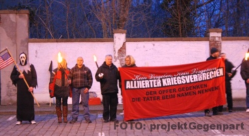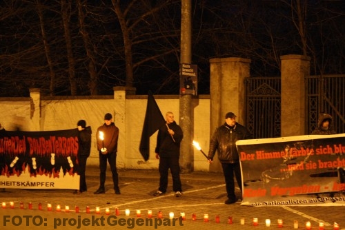 07. März 2012 / Dessau-Roßlau Etwa 20 Rechtsextremisten haben sich in den Abendstunden des 07. Märzes 2012 am Dessauer Friedhof III versammelt und sind zu einer vom Dessauer Neonaziaktivisten Alexander Weinert angemeldeten Kundgebung gekommen. Anlass der sogenannten Mahnwache war der Jahrestag der Bombardierung der Stadt durch die Alliierten am 07.03.1945. Von der Öffentlichkeit fast völlig unbemerkt, standen die Neonazis mit brennenden Fackeln da und spielten in einer durch und durch grotesken Inszenierung auf der Klaviatur von Geschichtsverfälschung und glorifizieren damit die nationalsozialistischen Verbrechen. Eine Veranstaltung dieser Art gehört alljährlich zum Repertoire der Neonazis, als Einstimmung für den im März stattfindenden Aufmarsch (mehr dazu hier... und hier...).
