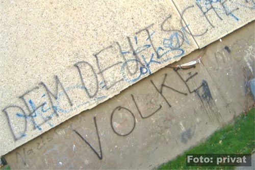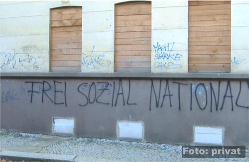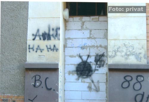 20. Oktober 2008 / Dessau-Roßlau In der Tornauer Straße im Stadtteil "Innerstädtisch Süd" stellt eine engagierte Bürgerin mehrere rechtsextreme Parolen und Codes fest. Die Schmierereien sind dabei auf einem baufälligen Abbruchhaus aufgebracht worden. ![]() Der rechte Zahlencode "88" steht so für die NS-Parole "Heil Hitler" und soll in Verbindung mit dem Zusatz "Rock and Roll" einen Bezug zur neoanzistischen Musikszene, dem so genannten Rechtsrock, darstellen. ![]() ![]() ![]() In der Muldestadt sind in den letzten Monaten verstärkt rechtsextreme Propagandadelikte und Sachbeschädigungen zu verzeichnen (mehr dazu hier...) und (hier...) und (hier...). Quelle: eigener Bericht |